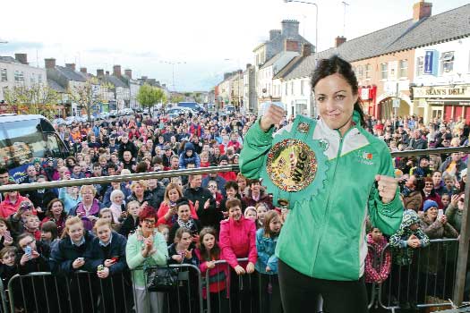 Carrick: this one’s for you! Boxer Christina McMahon proudly displayed her WBC title belt to the crowd of several hundred who welcomed her home to the Main Street in Carrickmacross on Tuesday evening. It might be only the interim female world bantamweight title, but to everyone in Monaghan, she is the county’s new international boxing champion, rivalling the achievements of the Clones Cyclone. The full title remains one fight away, but that could be some time down the road. “I have to be world champion before I turn fifty”, Christina joked as she was interviewed live on stage by Sean McCaffrey of Northern Sound. She hopes her success against Catherine Phiri in faraway Zambia on Saturday night will help to inspire other women to achieve their goals. Young or old, go out and do what you can, was her message. “I’m just a boxer, but I want to inspire people never to give up. I didn’t, and I want to thank the Phoenix Centre (in Carrickmacross, where she used to be manager) for living the story with me”.