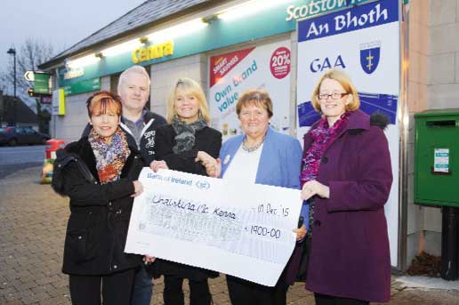 Christina McKenna, Scotstown, who was the winner of the Tydavnet Parish Schools Fund Tylotto Jackpot being presented with her cheque for €1,900 by some of the Tylotto team. In photo are (L-R) Colleen McCague, Michael Owen McMahon, McMahon’s Centra, seller of the winning ticket, Amanda McKenna, Christina McKenna and Barbara Brady. ©Rory Geary/The Northern Standard