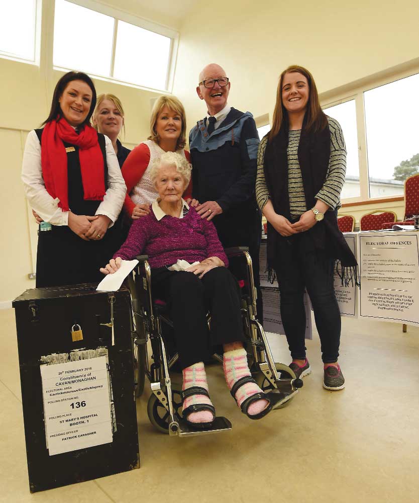 The widowed mother-of–four, whose husband, James, died in 1955, was assisted to the booth in her wheelchair by staff at St. Mary’s Hospital, Castleblayney, where she has been domiciled for a number of years. She was a former member of staff at the hospital prior to her retirement from service as a carer at the age of 65.