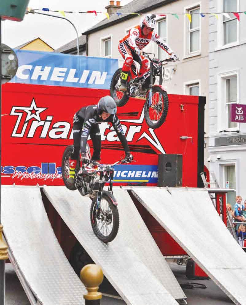 Trialstar bikers entertaining specatators during the Stree Carnival at Muckno Mainia Festival in Castleblayney last weekend. Report and pictures on pages 22 & 23.Photo © Jimmy Walsh