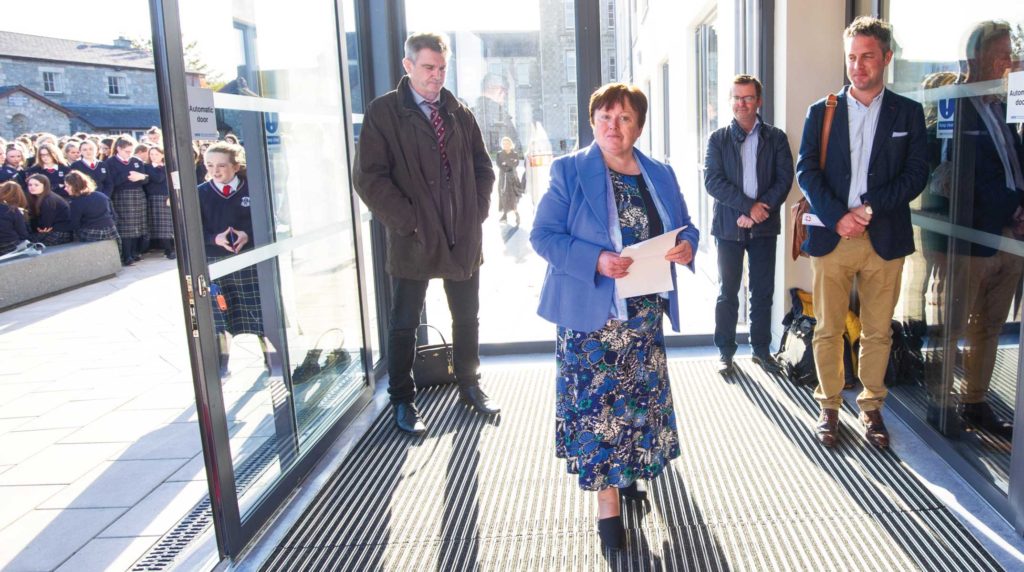 Recently retired principal of St Louis Secondary School, Monaghan, Vera O’Brien saw a long-cherished dream realised on Monday with the official opening of the school’s new extension. She is pictured by Northern Standard photographer Rory Geary about to address the ceremony watched by Alastair Keys of Keys and Monaghan Architects, and Dept of Education architects Ben McCabe and Ciaran O’Brien. Current school principal Margaret Conlon said on Monday: “Without Vera’s persistence, commitment, dedication, stubbornness…this project would not have come to fruition.” (See page 16 for story by Veronica Corr and more pics by Rory Geary)