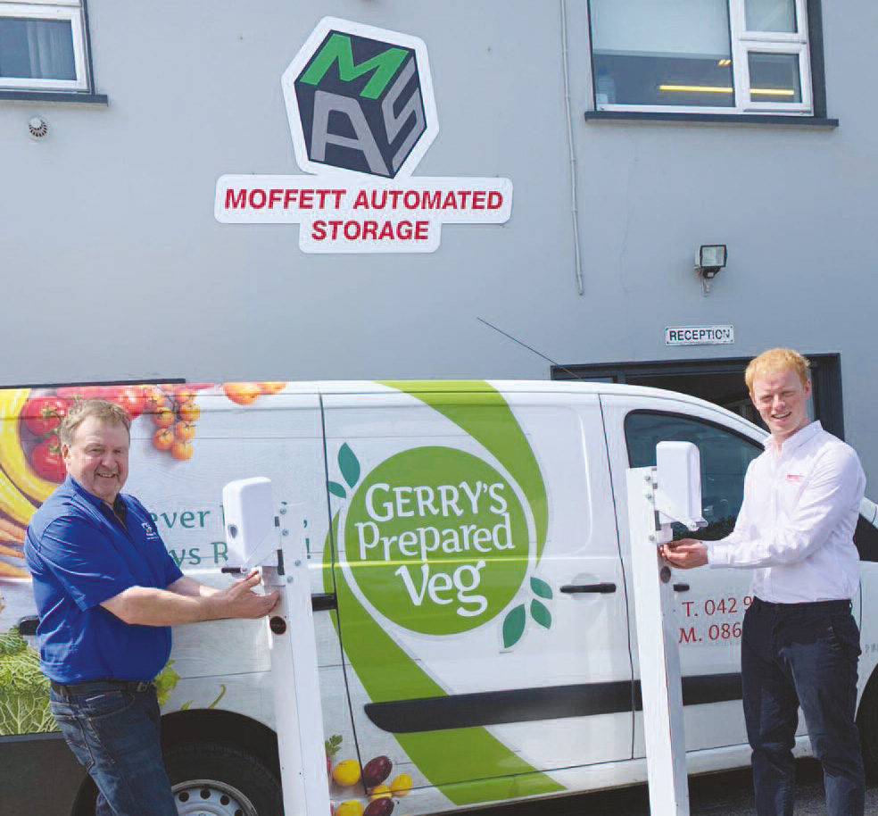 Gerry McElroy, Gerry’s Prepared Veg, Ballybay pictured as he receives delivery of two smart hand sanitisers from Sam Moffet, Moffett Automated Storage. Gerry was the recipient of the 1000th smart Footizer product sold. The ingenious product, designed and produced in the Moffett Automated Storage Clontibret premises, releases hand sanitiser without requiring any hand contact and is proving popular for retailers and businesses as they begin to reopen to the public and welcome their customers back safely.