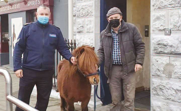 On Tuesday social media lit up, with a quirky video posted by Gardaí in Carrickmacross, who apprehended a Shetland Pony on Main Street in the early hours of the morning. The chestnut stallion had apparently escaped from his paddock on the Shercock Road and made his way into town where he was playing havoc with traffic (according to the Cavan Monaghan Garda Division Facebook page). Gardaí were keen to reunite the handsome fellow with his owner, who turned out to be local man Pat Cassidy. Tony the Pony was accommodated in a roofless area within the station that functions as a smoking area for short-term prisoners.