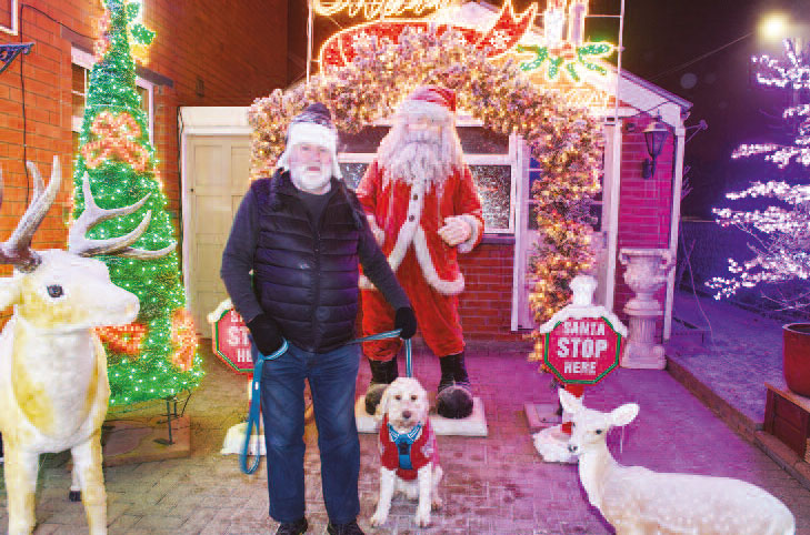 Mickey Treanor and his dog Ollie, with some of Francie Coogan’s display of Christmas lights,