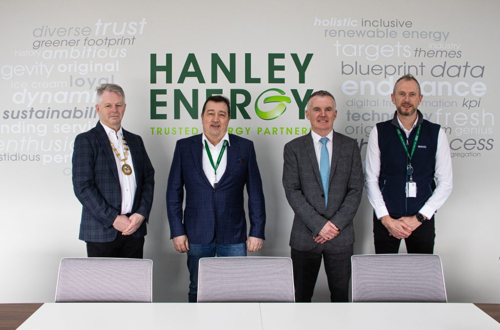 Caption: Councillor Rayomd Aughey,Dennis Nordon Managing Director and Co Founder of Hanley Energy, Senator Robbie Gallagher,, Edard Pepper Director of Hanely Energy.