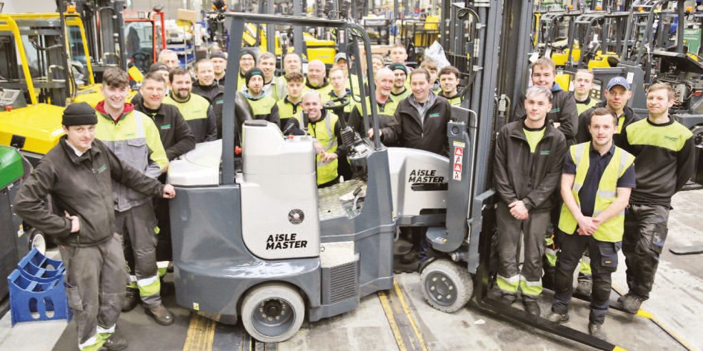 The Combilift team pose with the 75,000th truck as it comes off the production line.